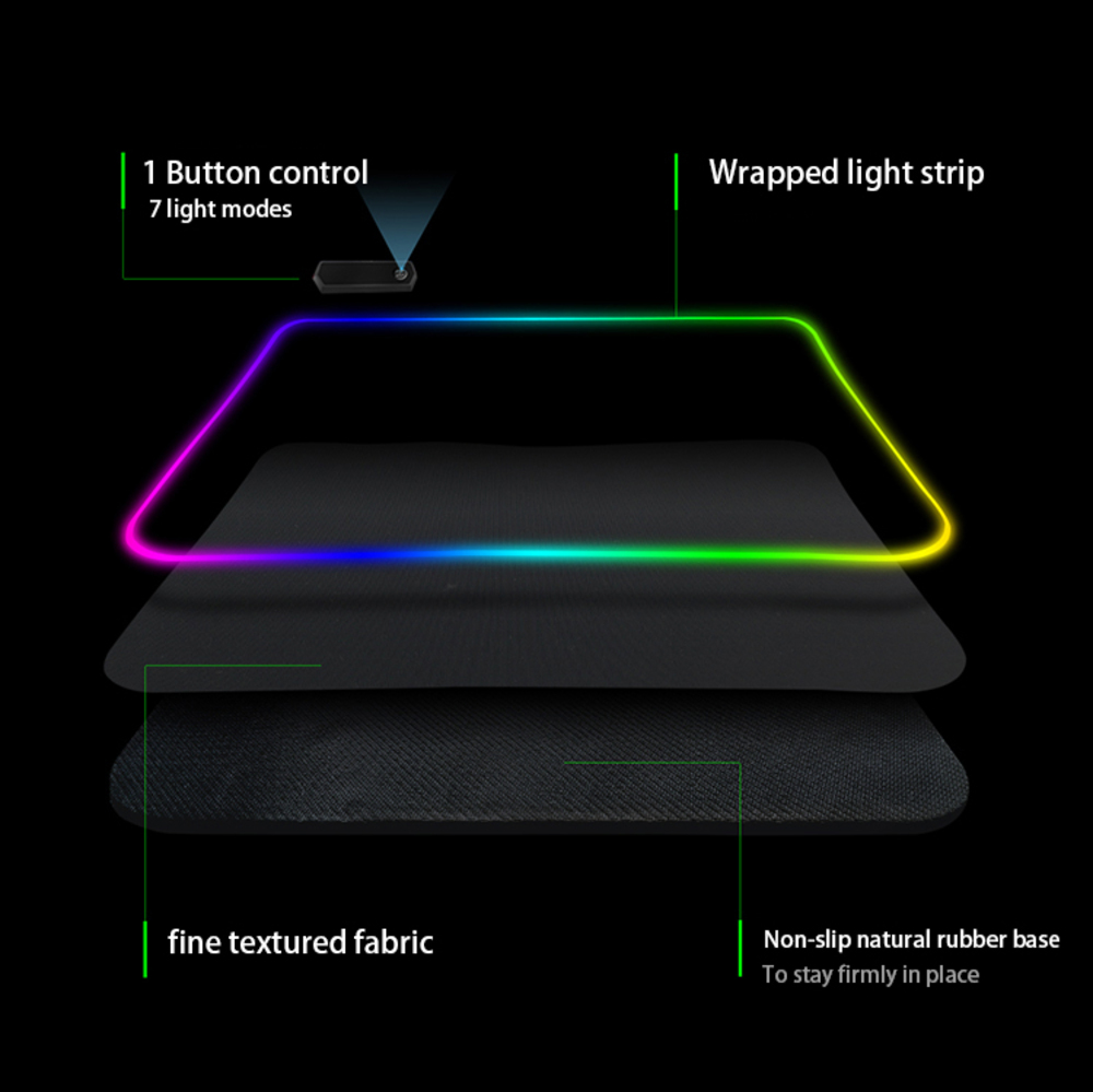 Large RGB Thick Non Slip Thick Rubber Soft Cloth Gaming Black Mouse pad. Microfiber Cloth + Natural Rubber. Anti-slip bottom. Ideal glide-abilities. Liquid repellent. Densely woven surface for accurate optical tracking.