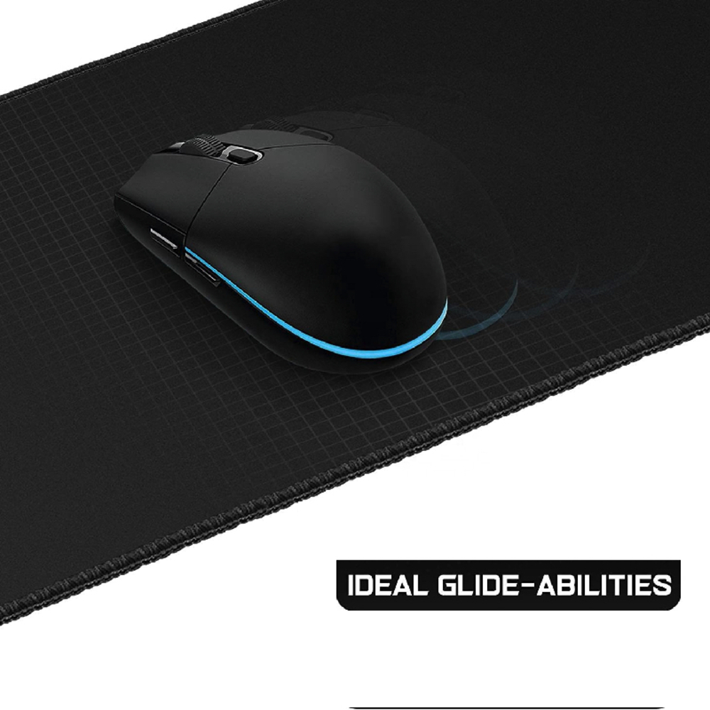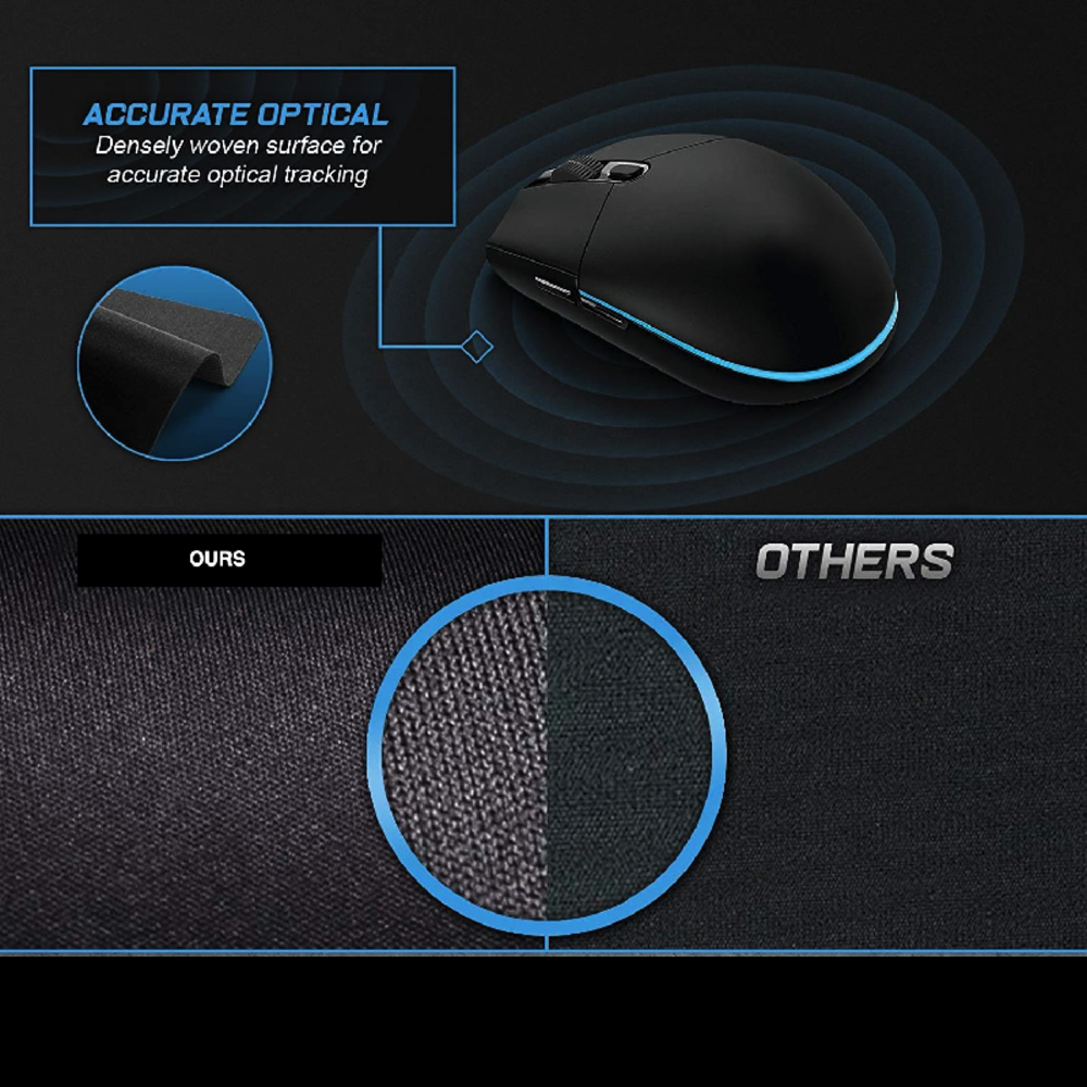 Large Stitched Edges Thick Non Slip Thick Rubber Soft Cloth Gaming Black Mouse pad.Microfiber Cloth + Natural Rubber. Anti-slip bottom. Ideal glide-abilities. Liquid repellent. Densely woven surface for accurate optical tracking.